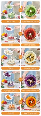 ?يقطع البصل والكرفس والثوم والجزر والخضروات الأخرى والسلطة والفـــواكه واللحـــوم وما إلى ذلك بســـرعة.